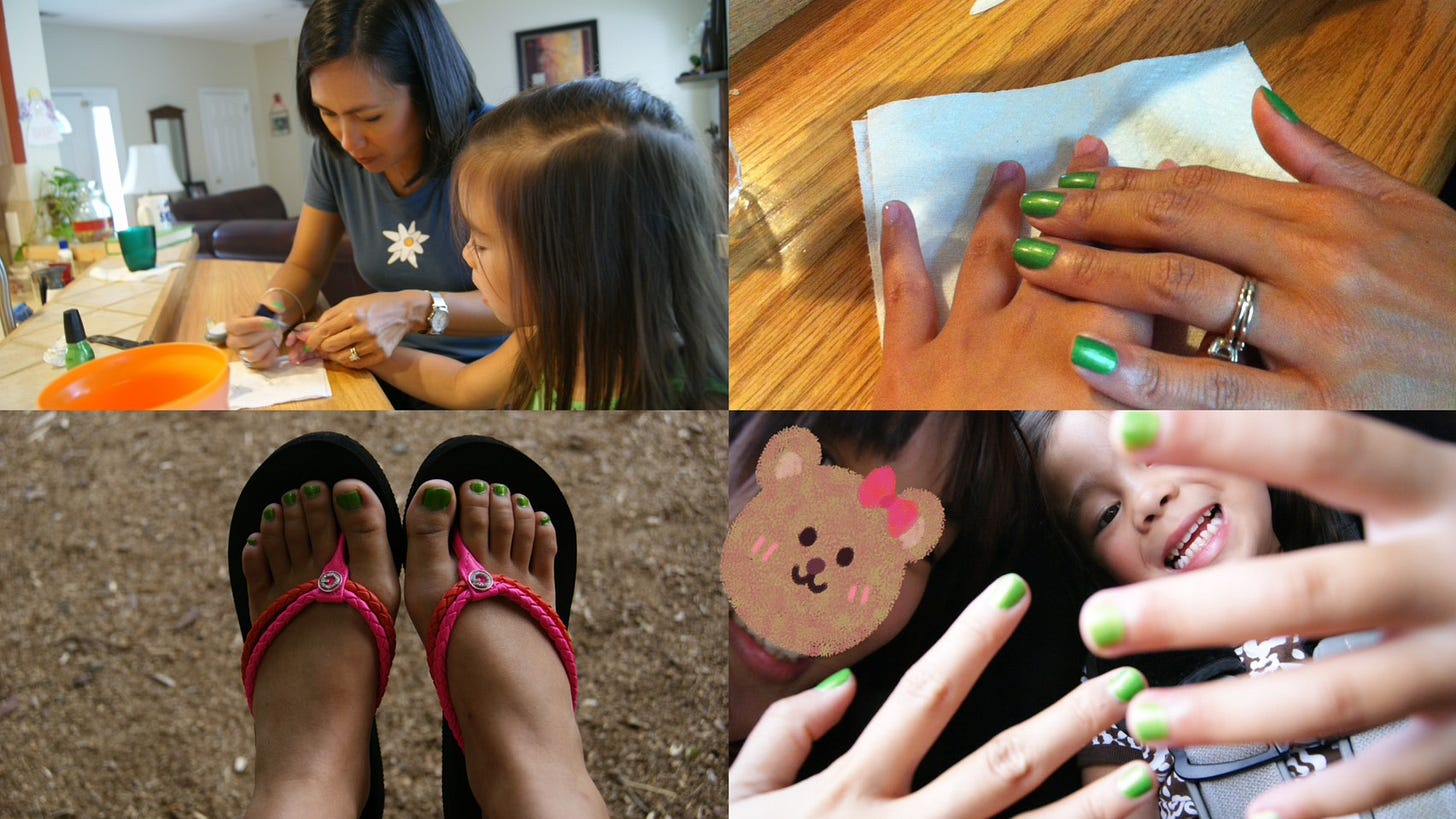 某天,我看到 Lisa 正在幫四歲的 Luci 塗指甲油,顏色竟然是飽和度極高的「螢光綠」。正當我還在糾結這顏色是否太前衛時,年紀還小 Luci 卻用充滿自信的語氣說: